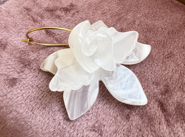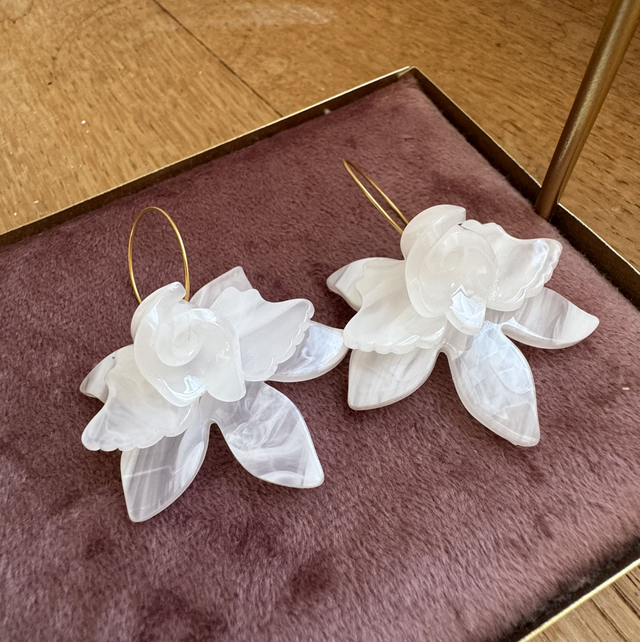 On craque totalement pour ses nouvelles boucles d'oreilles fleurs marbrées blanches en relief qui embelliront toutes vos tenues.