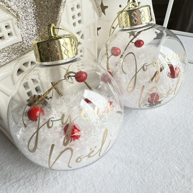 Cette magnifique boule de neige avec des branches à boules rouges illuminera votre sapin pour les fêtes.
